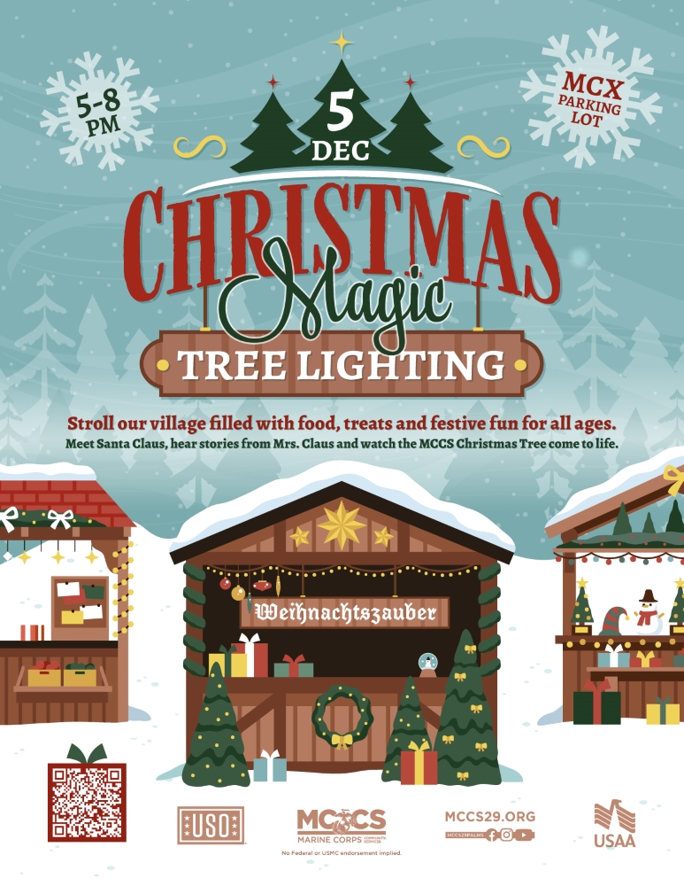 Stroll our village filled with a trail of twinkling lights, the sweet voices of carolers and 12 booths of wonder. Enjoy food, treats and festive fun for all ages, ending with a very special lighting of the MCCS Christmas tree.
