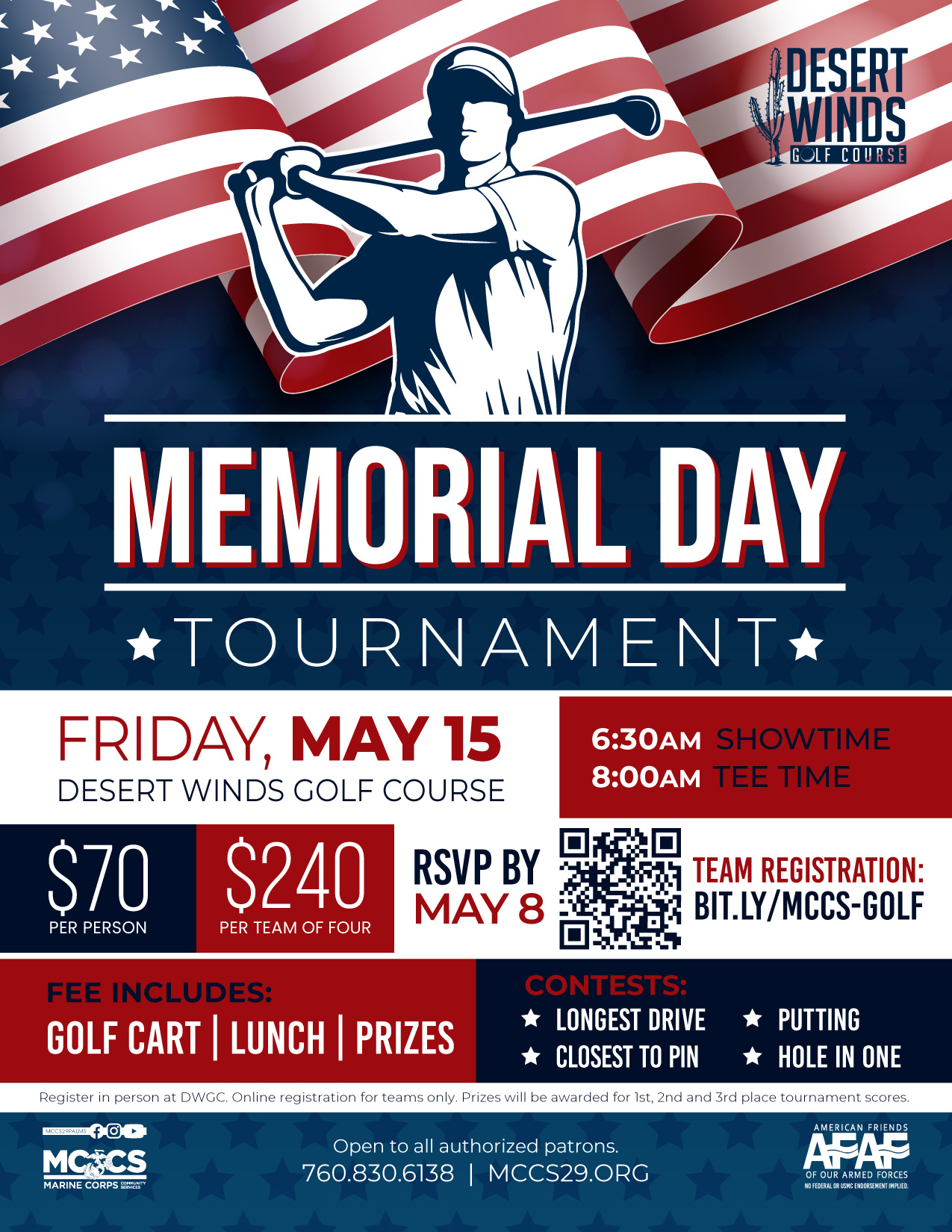 Register by May 8 in person at the Pro Shop. Online registration for teams only.