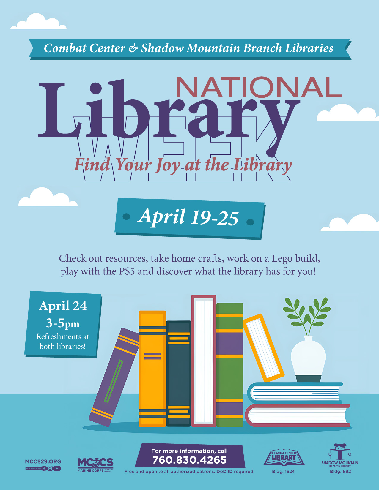 April 24 Refreshments from 3:00 - 5:00pm at both libraries.