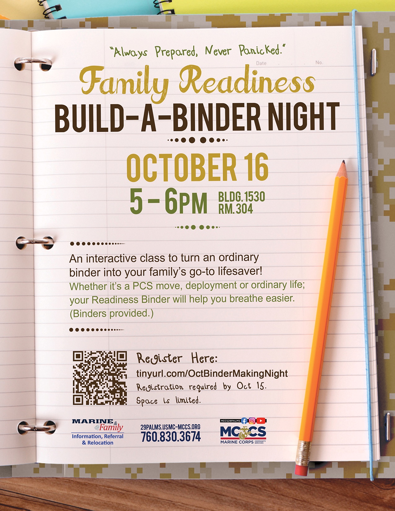 Whether it's a PCS move, deployment or ordinary life; your Readiness Binder will help you breath easier. (Binders provided.)