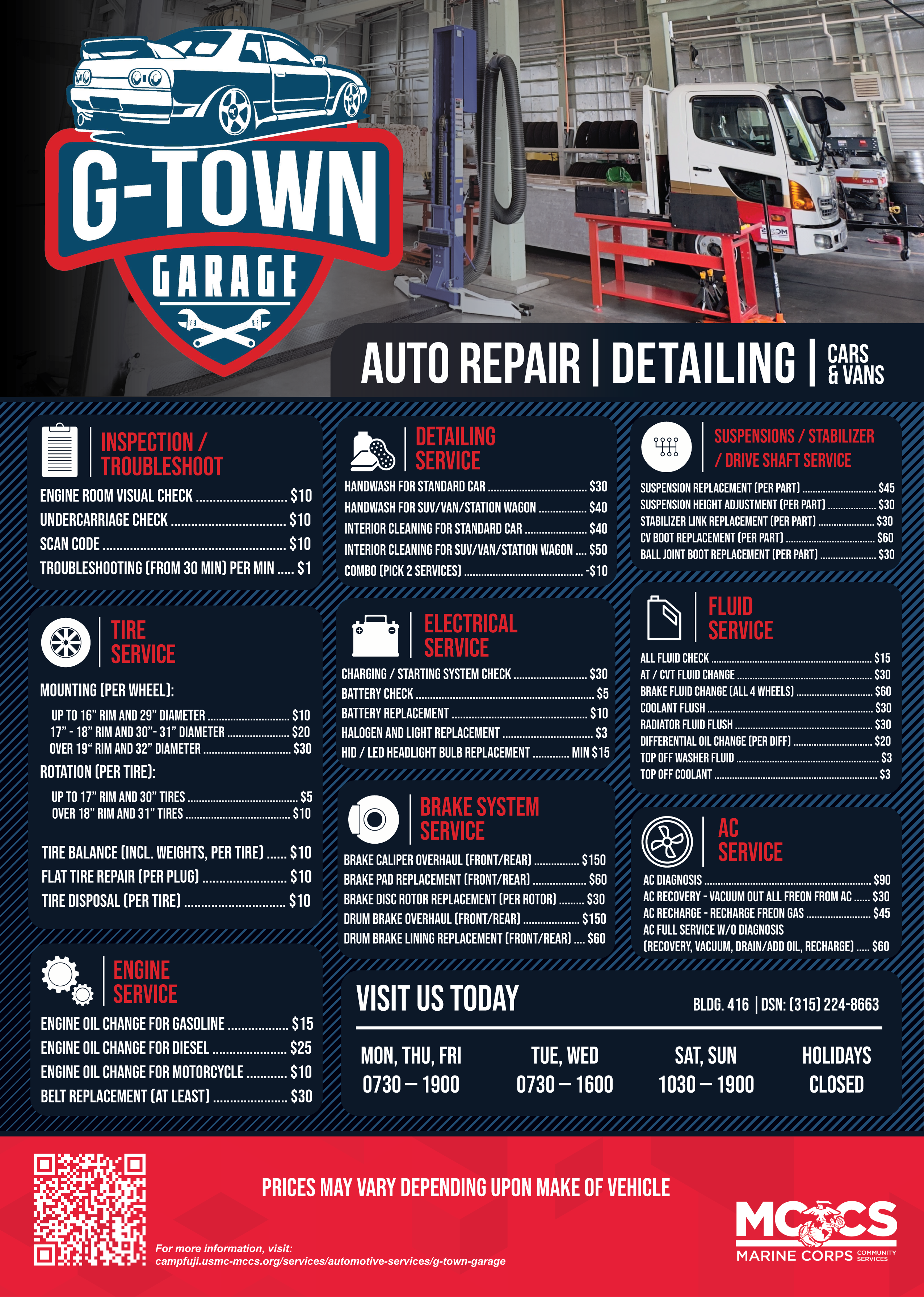 Please see the garage service desk for more information on all of our services offered.